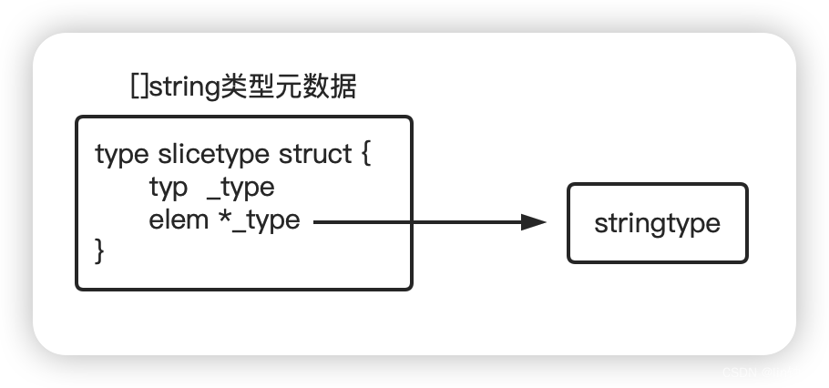 type slicetype struct { typ _type elem *_type}在 slice 类型元数据后面还记录了一个 elem 的类型元数据,指向其存储元素的类型元数据。如果是 string 类型的 slice,那 elem 指针指向的就是 string 类型的元数据。