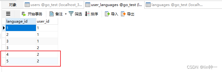 u := User{}db.Where("id = ?", 2).Find(&u)l1 := Language{ Name: "俄语",}l2 := Language{ Name: "法语",}db.Model(&u).Association("Languages").Append(&l1, &l2)
