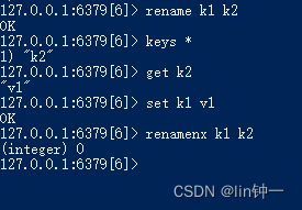 127.0.0.1:6379[6]> rename k1 k2OK127.0.0.1:6379[6]> keys *1) "k2"127.0.0.1:6379[6]> get k2 #获取key对应的值,如果key不存则返回nil,get只处理字符串类型数据"v1"127.0.0.1:6379[6]> set k1 v1OK127.0.0.1:6379[6]> renamenx k1 k2(integer) 0