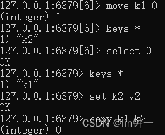 127.0.0.1:6379[6]> move k1 0(integer) 1127.0.0.1:6379[6]> keys *1) "k2"127.0.0.1:6379[6]> select 0OK127.0.0.1:6379> keys *1) "k1"127.0.0.1:6379> set k2 v2OK