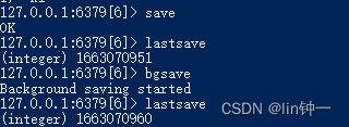 127.0.0.1:6379[6]> saveOK127.0.0.1:6379[6]> lastsave(integer) 1663070951127.0.0.1:6379[6]> bgsaveBackground saving started127.0.0.1:6379[6]> lastsave(integer) 1663070960