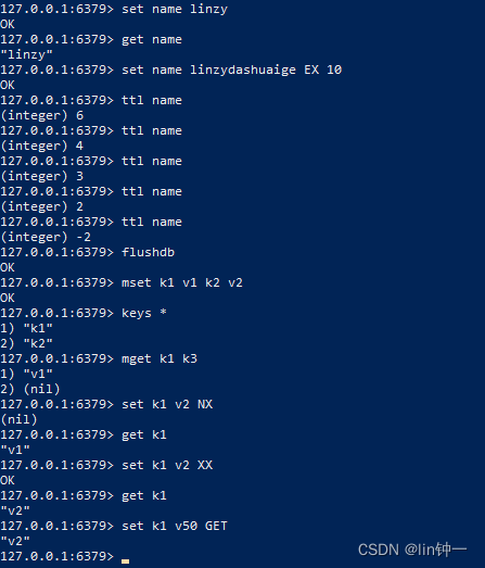 #添加一个key为"name" 值为"linzy"的键值对127.0.0.1:6379> set name linzyOK#查看key为name对应的值127.0.0.1:6379> get name"linzy"#设置key为name的键值对10秒后过期127.0.0.1:6379> set name linzydashuaige EX 10OK#查看key剩余多少生存时间,key不存在则返回-2,永久键值对则返回-1127.0.0.1:6379> ttl name(integer) 6127.0.0.1:6379> ttl name(integer) 4127.0.0.1:6379> ttl name(integer) 3127.0.0.1:6379> ttl name(integer) 2127.0.0.1:6379> ttl name(integer) -2#清空当前库的所有键值对127.0.0.1:6379> flushdbOK#添加多条键值对127.0.0.1:6379> mset k1 v1 k2 v2OK#查看当前库的所有键值对127.0.0.1:6379> keys *1) "k2"2) "k1"#如果查不到则返回nil127.0.0.1:6379> mget k1 k31) "v1"2) (nil)#添加一个key为k1 值为v2的键值对,只有k1不存在才执行127.0.0.1:6379> set k1 v2 NX(nil)127.0.0.1:6379> get k1"v1"#将key为k1的值修改为v2,只有k1存在才执行127.0.0.1:6379> set k1 v2 XXOK127.0.0.1:6379> get k1"v2"127.0.0.1:6379> set k1 v50 GET"v2"