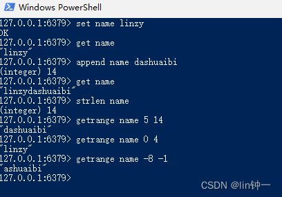 127.0.0.1:6379> set name linzyOK127.0.0.1:6379> get name"linzy"#在key为name的内容后添加“dashuaibi”127.0.0.1:6379> append name dashuaibi(integer) 14127.0.0.1:6379> get name"linzydashuaibi"#获取key为name的字符串长度127.0.0.1:6379> strlen name(integer) 14#获取key为name的字符串在[5, 14]范围内的子串127.0.0.1:6379> getrange name 5 14"dashuaibi"127.0.0.1:6379> getrange name 0 4"linzy"127.0.0.1:6379> getrange name -8 -1"ashuaibi"