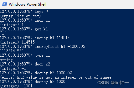 127.0.0.1:6379> keys *(empty list or set)#将key为k1的值加一。k1不存在自动创建一个value为0的键值对127.0.0.1:6379> incr k1(integer) 1127.0.0.1:6379> get k1"1"#将key为k1的值加114514127.0.0.1:6379> incrby k1 114514(integer) 114515#将key为k1的值加-1000.05127.0.0.1:6379> incrbyfloat k1 -1000.05"113514.95"#虽然value是数值,但是他的数据类型还是string,他依旧可以使用上面的指令127.0.0.1:6379> type k1string#将key为k1的值减一。k1不存在自动创建一个value为0的键值对127.0.0.1:6379> decr k2(integer) -1#将key为k1的值减1000.02127.0.0.1:6379> decrby k2 1000.02(error) ERR value is not an integer or out of range127.0.0.1:6379> decrby k2 1000(integer) -1001