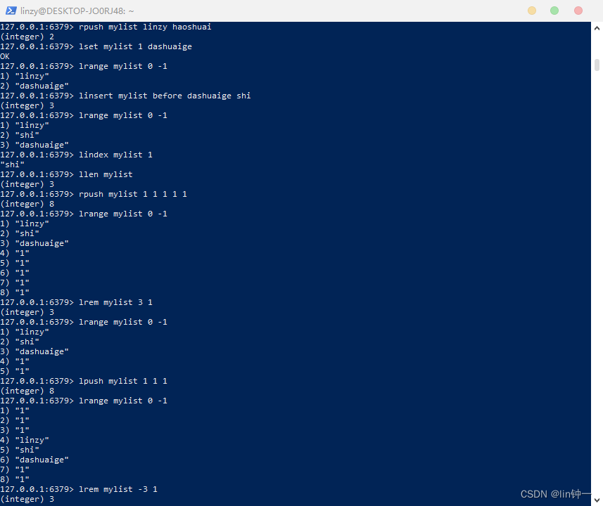 127.0.0.1:6379> rpush mylist linzy haoshuai(integer) 2# 将key为mylist的列表索引为1的值改为dashuaige127.0.0.1:6379> lset mylist 1 dashuaigeOK127.0.0.1:6379> lrange mylist 0 -11) "linzy"2) "dashuaige"# 在key为mylist的列表的基准值"dashuaige"之前插入元素"shi"。(基准值就是从左往右找到的第一个元素就是基准值)127.0.0.1:6379> linsert mylist before dashuaige shi(integer) 3127.0.0.1:6379> lrange mylist 0 -11) "linzy"2) "shi"3) "dashuaige"# 获取key为mylist的列表索引为1的值127.0.0.1:6379> lindex mylist 1"shi"# 获取key为mylist的列表长度127.0.0.1:6379> llen mylist(integer) 3127.0.0.1:6379> rpush mylist 1 1 1 1 1(integer) 8127.0.0.1:6379> lrange mylist 0 -11) "linzy"2) "shi"3) "dashuaige"4) "1"5) "1"6) "1"7) "1"8) "1"# 在key为mylist的列表从左往右删除3个"1"元素127.0.0.1:6379> lrem mylist 3 1(integer) 3127.0.0.1:6379> lrange mylist 0 -11) "linzy"2) "shi"3) "dashuaige"4) "1"5) "1"127.0.0.1:6379> lpush mylist 1 1 1(integer) 8127.0.0.1:6379> lrange mylist 0 -11) "1"2) "1"3) "1"4) "linzy"5) "shi"6) "dashuaige"7) "1"8) "1"# 在key为mylist的列表从右往左删除3个"1"元素127.0.0.1:6379> lrem mylist -3 1(integer) 3127.0.0.1:6379> lrange mylist 0 -11) "1"2) "1"3) "linzy"4) "shi"5) "dashuaige"# key为mylist的列表只保留[2, 5]的范围的子序列127.0.0.1:6379> ltrim mylist 2 5OK127.0.0.1:6379> lrange mylist 0 -11) "linzy"2) "shi"3) "dashuaige"